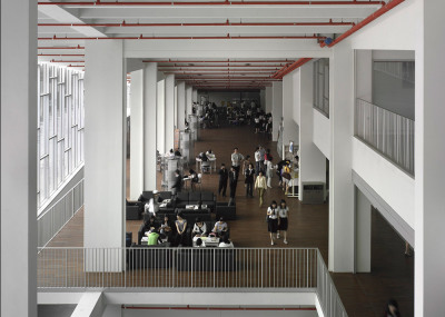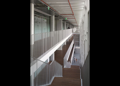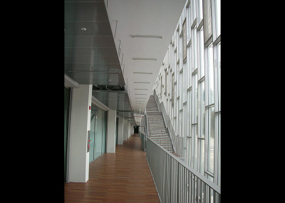 کانسپت طرح و ایده های فضایی "دومینیک پرولت Dominique Perrault" در این بنا نیز همچون کتابخانه محلی فرانسه در پاریس بسیار شفاف و درعین حال آبستره می باشند. در مرکز سایت، آکس حرکتی وسیعی طراحی شده است که از فضای پیرامون میدان مقابل دانشگاه آغاز شده و همچون خطی مستقیم دانشگاه را می شکافد. درمرکز این مسیر، فضای تجمع و حیاطی مسطح وجود دارد که پیش فضای مقابل ورودی اصلی دانشگاه را تعریف می کند. نیمه دیگر به پلکانی عریض و شاخص اختصاص یافته که دسترسی به سایت را از ترازی بالاتر در جبهه پشتی ممکن می سازد. تناسبات پله ها به نحوی است که این فضای نیمه محصور را به فضای تجمعی در قلب دانشگاه تبدیل کرده و در بسیاری از مواقع از آن به عنوان آمفی تئاتر رو باز استفاده می شود. در زیر این پلکان بخش وسیعی از فضاهای داخلی نظیر آمفی تئاتر اصلی دانشگاه قرار دارد. جداره های این آکس تماماً شیشه بوده و نور طبیعی را به داخل فضاهای آموزشی، راهروهای ارتباطی و ویدهای داخل ساختمان منتقل می کنند. آنچه بسیار جالب توجه است، روشنایی جداره های این آکس در شب است که این فضا را به خطی از نور تبدیل کرده و به واسطه انعکاس روشنایی داخل ساختمان بر فریم های فلزی و براق جداره، فضایی رویایی و زیبا را در معرض دید و تجربه دانشجویان و شهروندان می گذارد. بدین ترتیب پیوندی ارگانیک و عمیق میان پروژه با سایت و زمینه شهری برقرار شده و نه تنها ساختمان در تراز بالایی به عنوان پارک و فضای سبز شهری به نظر می رسد، بلکه از آن به عنوان محل عبور و مرور، تجمع و تعاملات روزانه نیز استفاده می شود. در مقاطع عرضی ساختمان، بخش انتهایی بنا ارتفاعی معادل با شش طبقه داشته و در تراز زیرزمین ضمن پیوند دو ساختمان اصلی مستقل به یکدیگر از تمامی مساحت سایت استفاده شده است. در این طبقات علاوه بر بخش های اداری، کلاس های درس و سالن های سمینار و جلسات، فضاهای جنبی متنوعی نظیر کتابخانه، دو سالن سینما، سالن های ورزشی، فروشگاه های تجاری و پارکینگی به مساحت 20 هزار مترمربع در زیربام سبز دانشگاه قرار گرفته اند. علاوه بر آکس مرکزی، ورود به فضای داخلی از ورودی های فرعی در جداره های خارجی ساختمان ممکن بوده و آسانسورهایی نیز برای ورود مستقیم دانشجویان و معلولان تعبیه شده اند.